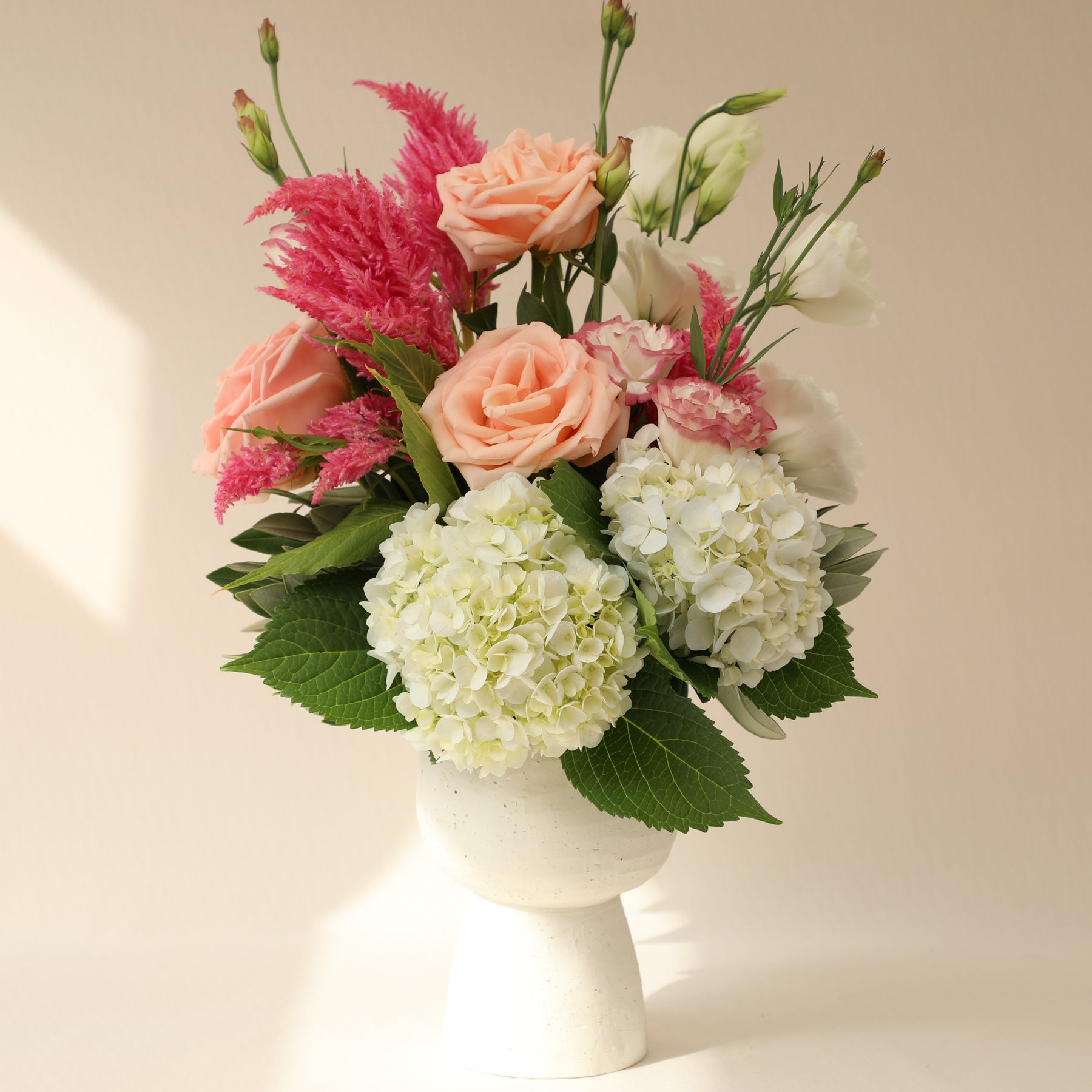 Thoughtfully curated with a stunning selection of seasonal blooms, this arrangement is styled in a charming textured ceramic vase and delivered in our signature Brooklyn bag for a beautiful, ready-to-enjoy gift.